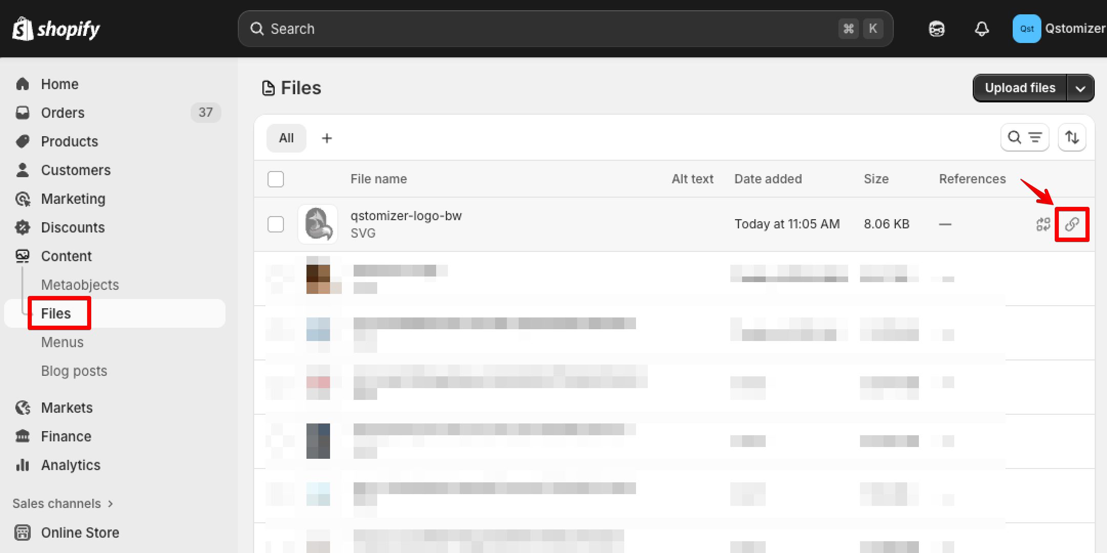 - First, go to the "Content" section of your Shop admin and upload the logo in the Files Section. .