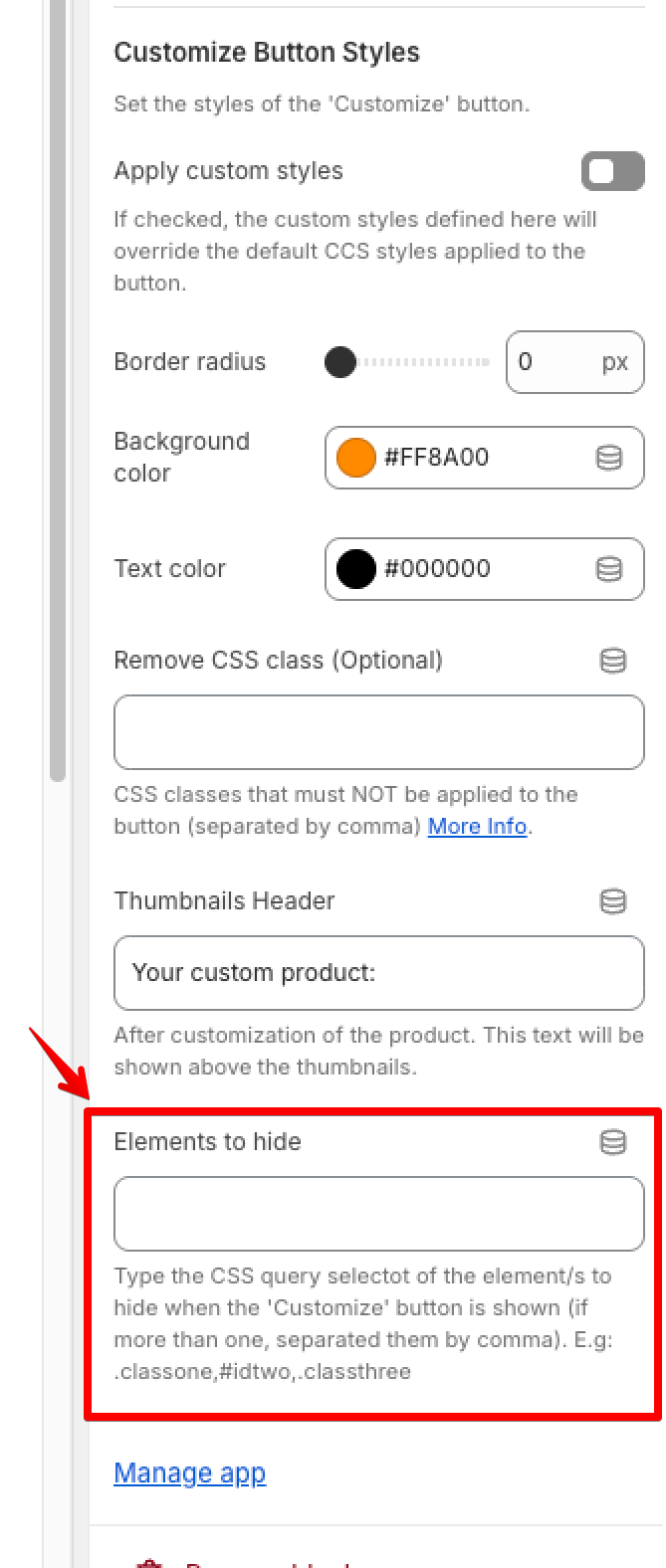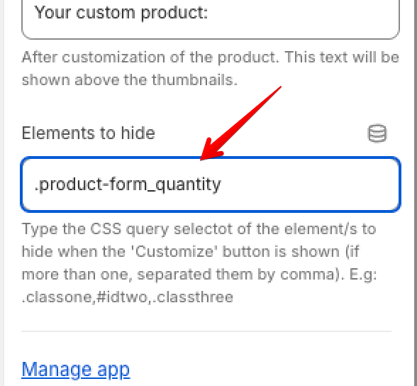 The simplest way is to use the field provided directly in the Qstomizer App Block settings in your Shopify theme. This field is specifically designed to target the any element of the page and hide it when customization is active.